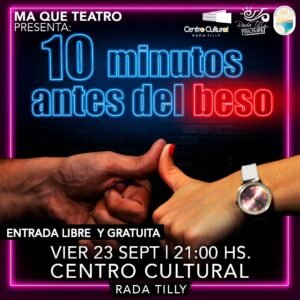 Este viernes 23 de septiembre vuelve a presentarse “10 minutos antes del beso” de la Compañía Ma que teatro. Una comedia romántica con enredos, con muchas alegrías y risas con situaciones confusas, donde se valoriza el amor, la inocencia y se rescatan los valores del estado de enamoramiento. La función libre y gratuita será el viernes 23, en el Centro Cultural Rada Tilly, a las 21 hs.