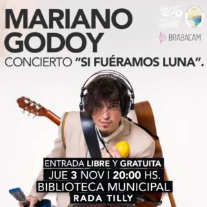 La propuesta para el jueves 3 de noviembre, llega junto al artista Mariano Godoy que presenta el concierto “Si fuéramos luna”: un viaje discografico de estilo pop neocriollo. El espectáculo musical será a las 20 hs. en la Biblioteca Municipal “Asencio Abeijón”, ubicada en Antártida Argentina N° 333. Tendrá entrada libre y gratuita, y el ingreso será por orden de llegada hasta agotar localidades.