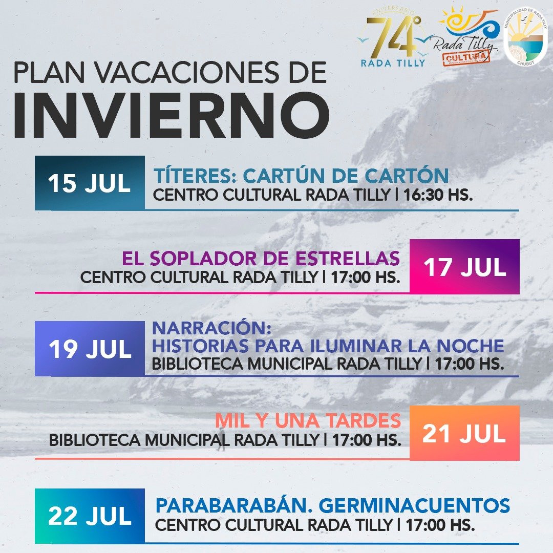 El programa inicia el viernes 15 de julio junto a “Cartún de Cartón”, una función de títeres para público infantil, a las 16:30 hs. en el Centro Cultural Rada Tilly, con entrada libre y gratuita.