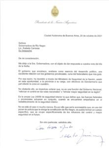 El presidente de la Nación Alberto Fernández emitió una carta dirigida a la gobernadora de la provincia de Río Negro, Arabela Carreras. Como respuesta tras el pedido de una mayor presencia de seguridad, ante los hechos de violencia ocurridos en los últimos días, por grupos autodenominados mapuches.
