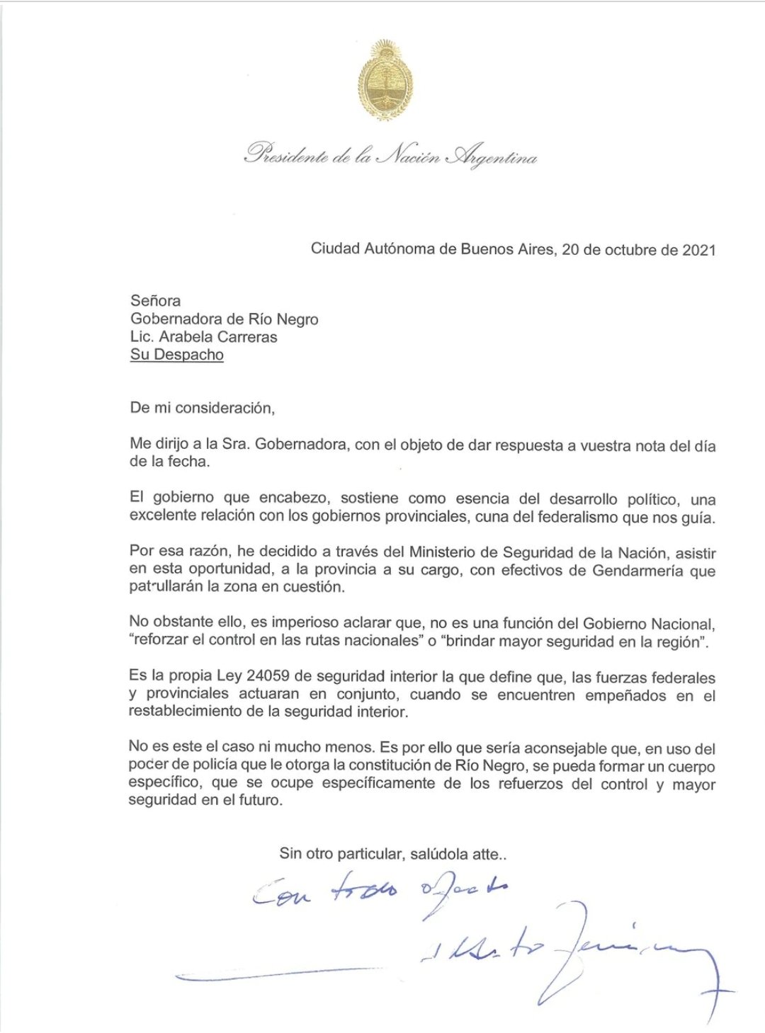 El presidente de la Nación Alberto Fernández emitió una carta dirigida a la gobernadora de la provincia de Río Negro, Arabela Carreras. Como respuesta tras el pedido de una mayor presencia de seguridad, ante los hechos de violencia ocurridos en los últimos días, por grupos autodenominados mapuches.