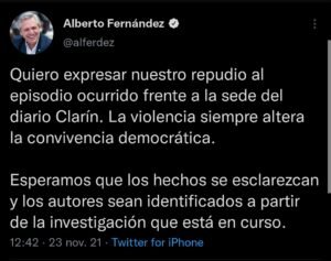 El presidente de la Nación Alberto Fernández utilizó la red social de Twitter para referirse a los recientes hechos de violencia contra la libertad de prensa que vivió el Grupo Clarín.