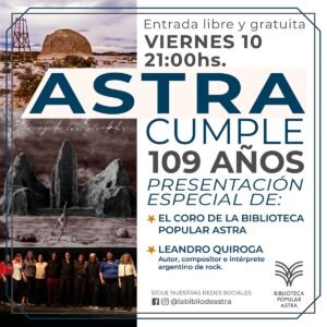 A partir de las 21:00 hs se presentará el Coro de la Biblioteca Popular de Astra y luego se realizará la presentación de Leandro Quiroga, autor, compositor e intérprete argentino de rock.