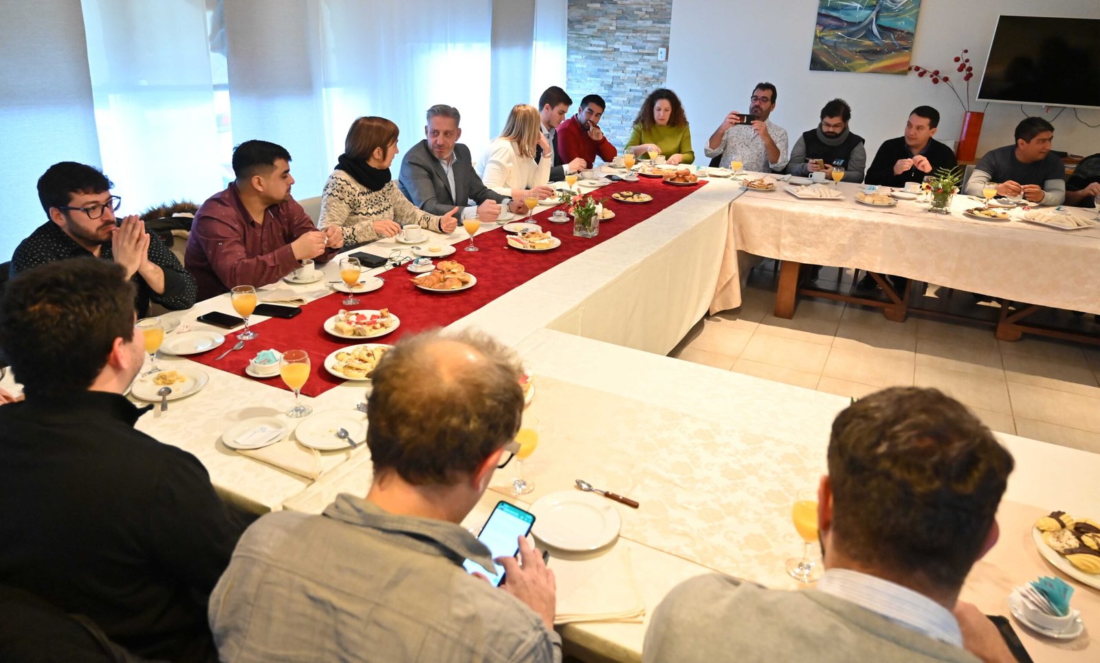 El mandatario y la subsecretaria de Información Pública, Vanesa Abril, compartieron un desayuno con los trabajadores de prensa en la Residencia Oficial en Rawson.