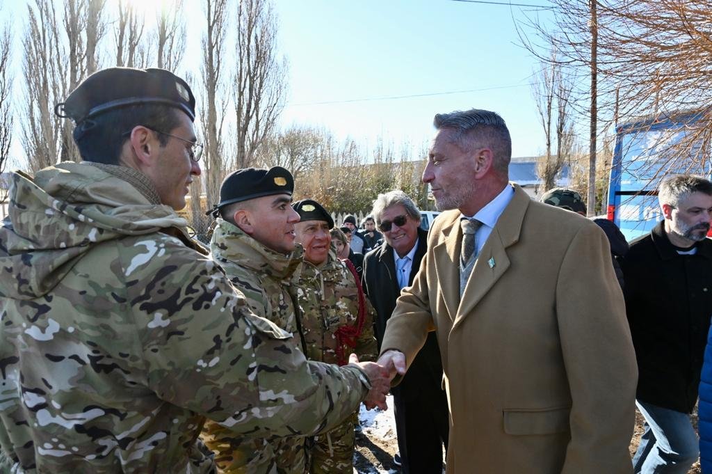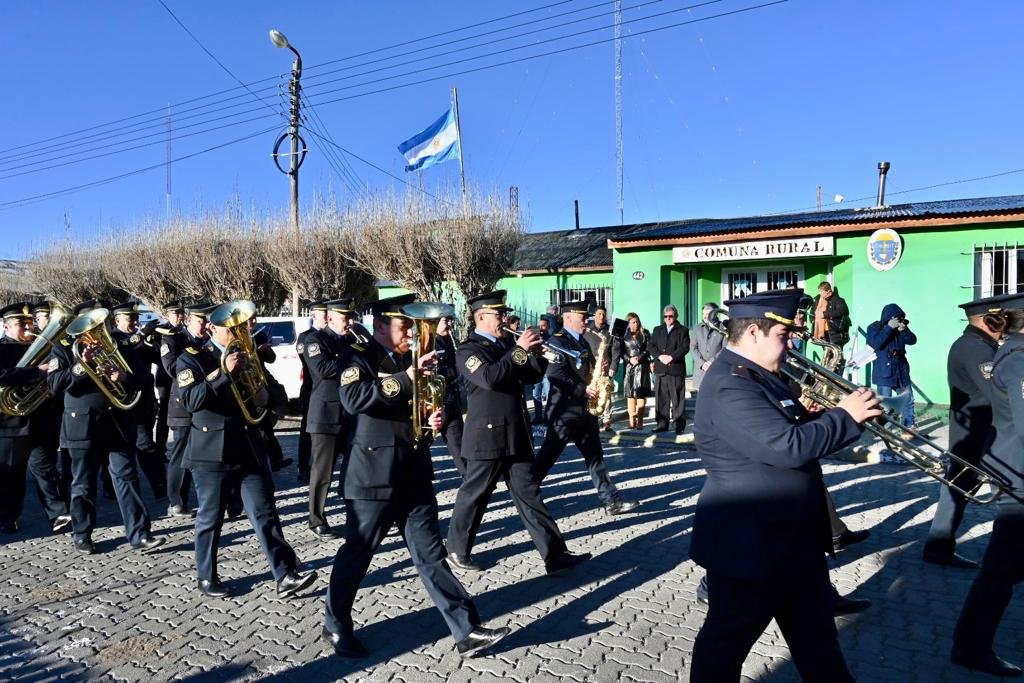 El acto se desarrolló en la Plaza San Martín con la participación de los ministros de Infraestructura, Energía y Planificación, Gustavo Aguilera, de Agricultura, Ganadería, Industria y Comercio, Leandro Cavaco, la presidenta de la AVP, Cynthia Gélvez, la gerenta general del IPVyDU, Ivana Papaianni, subsecretarios, el intendente de Río Mayo, Alejandro Avendaño, el jefe comunal de Aldea Apeleg, Marcos Pruessing, el jefe de la Policía del Chubut, Víctor Acosta, fuerzas de seguridad nacionales, invitados especiales.