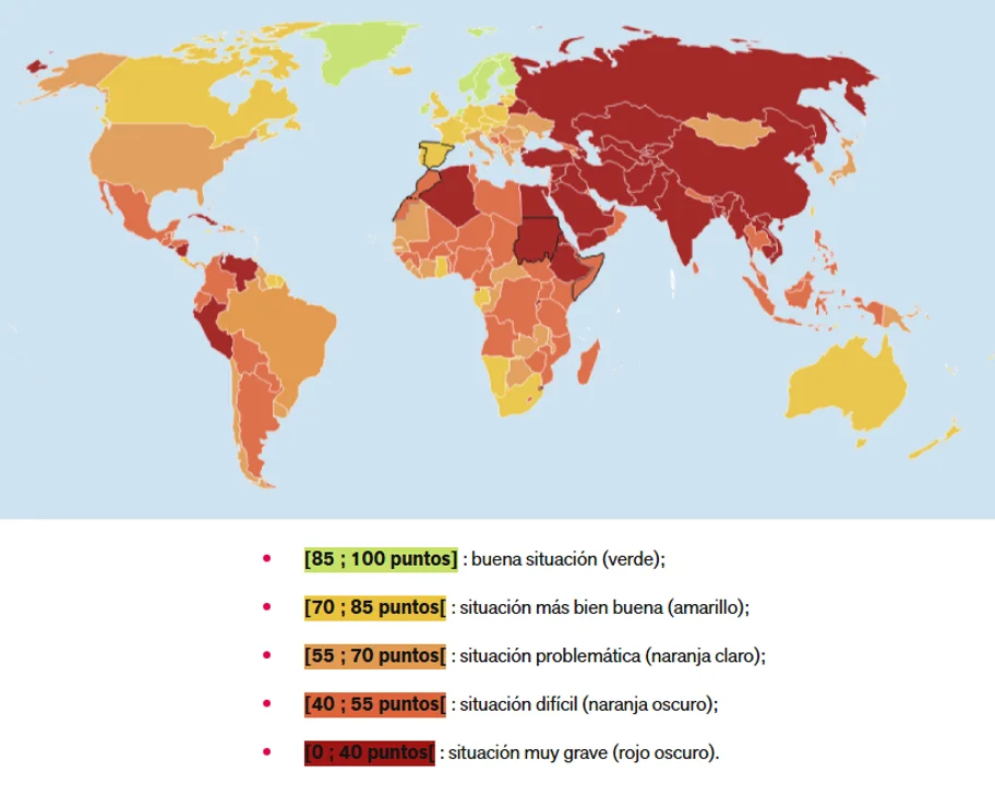 En ese sentido, más de la mitad (52,2%) de los países del mundo se encuentran en una situación “difícil” o “muy grave”, mientras que en la primera edición del ranking, de 2002, estos representaban una ínfima minoría (13,7%).