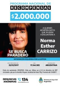 Norma “Lily” Carrizo de 54 años tomó un remis desde su casa, ubicada en barrio Pueyrredón, y se bajó sobre la calle Piedrabuena, en la ciudad de Rada Tilly, cerca de las 11 horas del 22 de diciembre de 2017. Fue la última vez que se puo de ella.