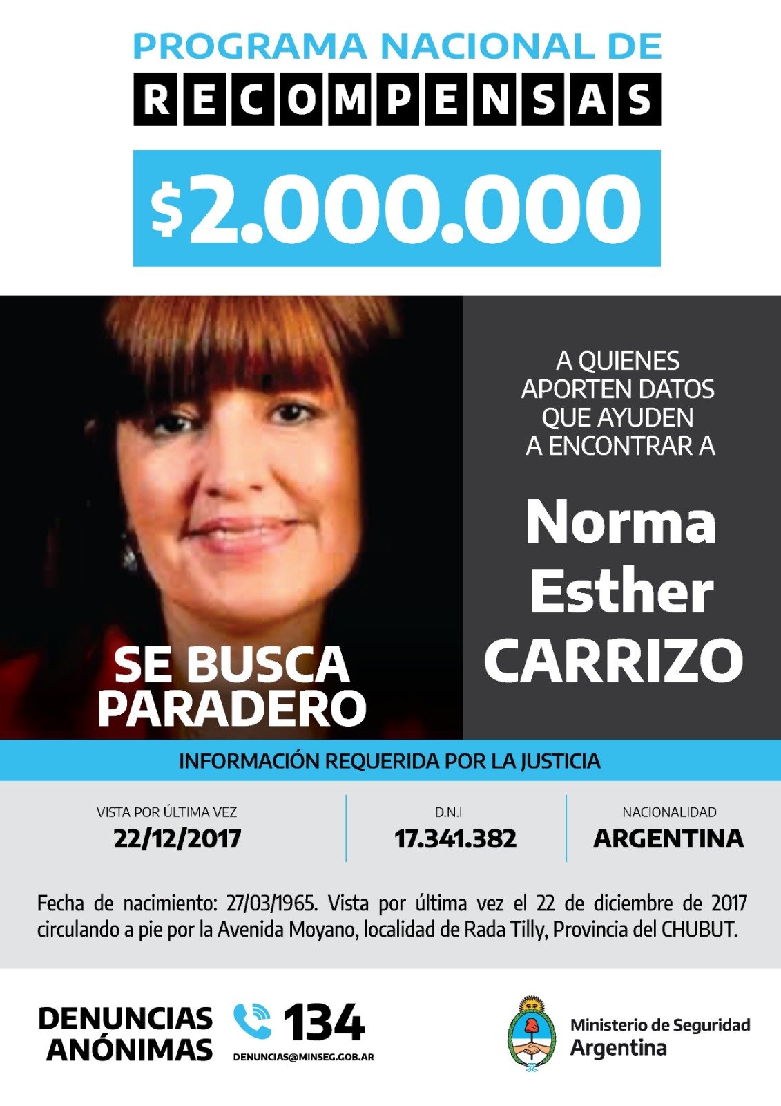 En las últimas horas, el Ministerio Público Fiscal de Comodoro Rivadavia informó que el Ministerio de Seguridad actualizó el valor de la recompensa por información sobre desaparecidos en la ciudad petrolera y en la villa balnearia.