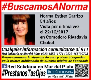 El viernes 22 de Diciembre de 2017 Norma «Lily» Carrizo, de 53 años fue vista por última vez en Avenida Moyano, en la localidad de Rada Tilly y desde entonces nunca más se supo de ella. Ese mismo día, Norma le envió un mensaje a una de sus hijas, cerca de las 11:51 de la mañana, antes de salir de su casa: