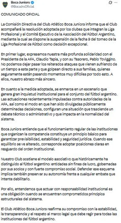 Boca Juniors respaldó públicamente a la AFA en medio del conflicto judicial que involucra a sus autoridades y apoyaron la suspensión de la fecha 9 de la Liga Profesional como medida excepcional.