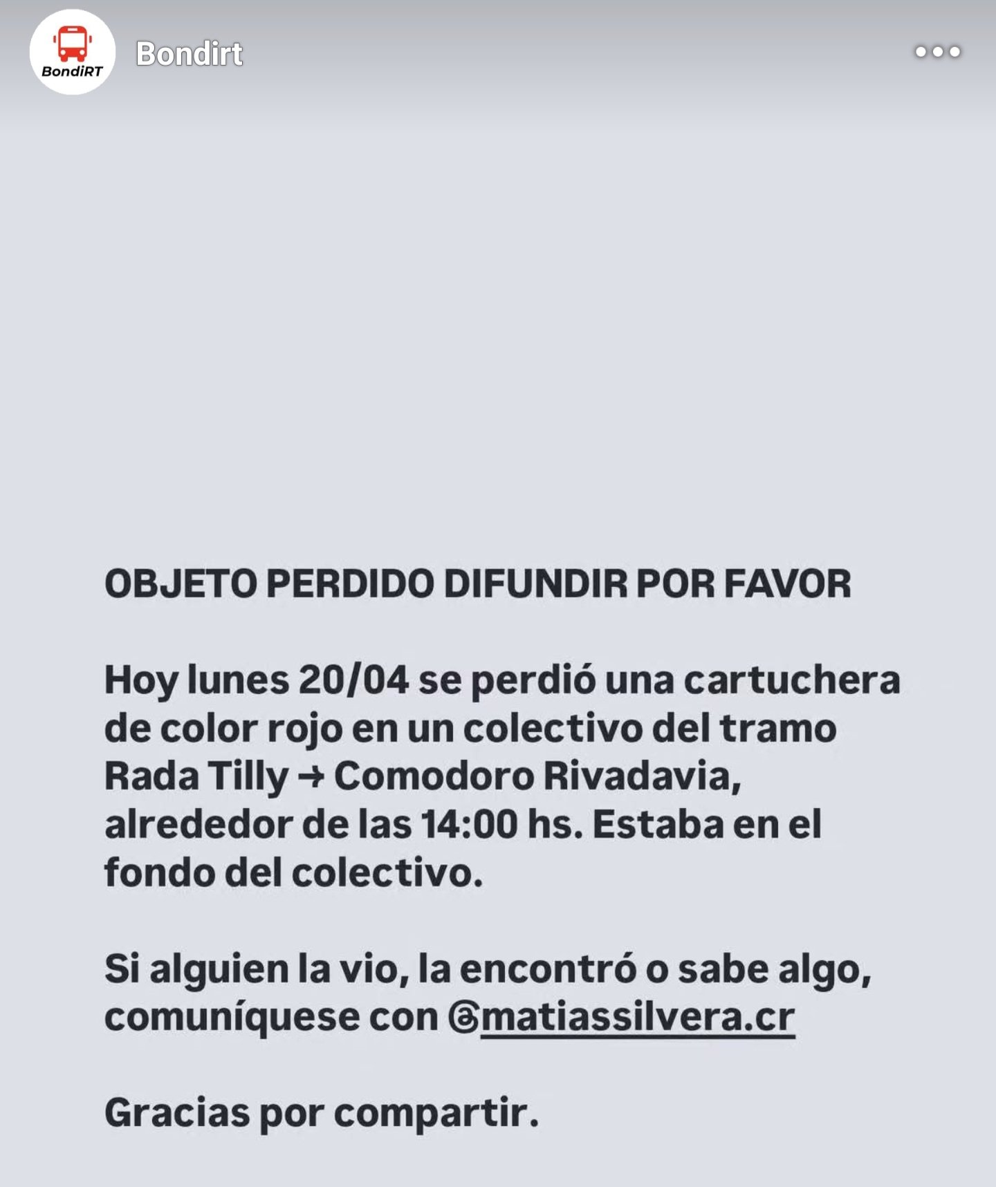 Un pedido de difusión comenzó a circular en las últimas horas tras la pérdida de un objeto en una unidad de Expreso Rada Tilly.