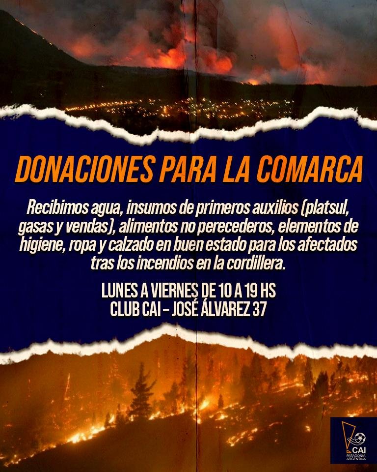 A raíz de los lamentables incendios en la Comarca Andina, la Comisión de Actividades Infantiles comenzó una campaña solidaria para ayudar a los vecinos de las localidades de El Hoyo, Lago Puelo, Cholila, El Maitén y Las Golondrinas.