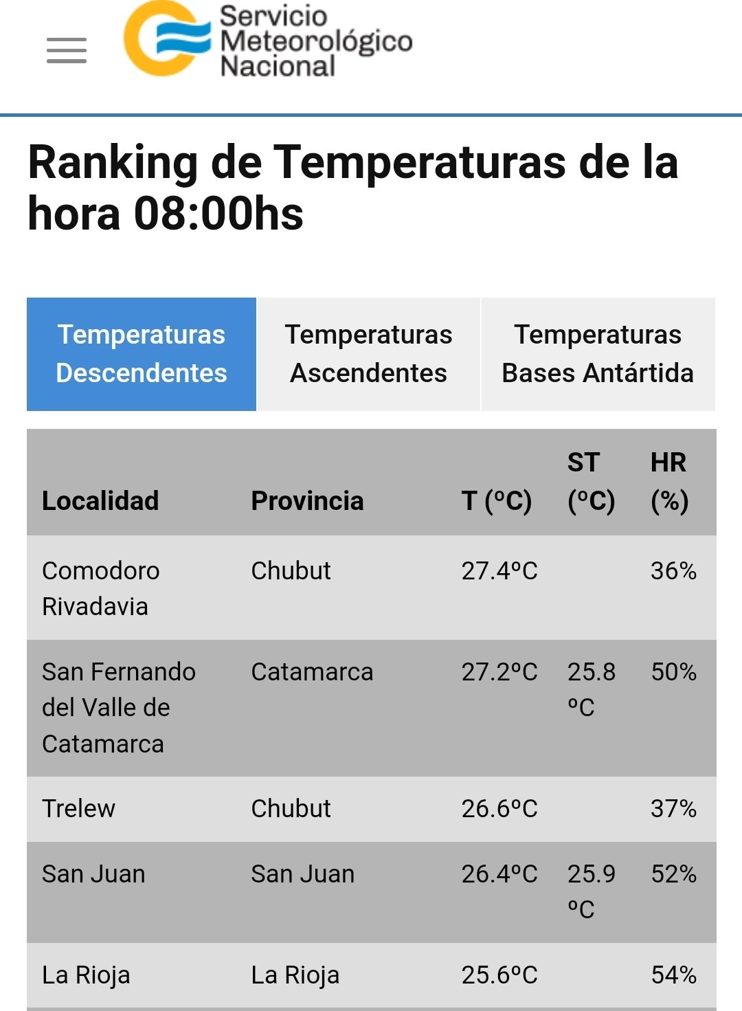 El termómetro siguió avanzando según pasaron las horas, y a las 15hs según datos oficiales publicados en la página web del SMN el termómetro había alcanzado la máxima informada por el portal de noticias meteorológicas Clima-Comodoro, unos 31.3°C.