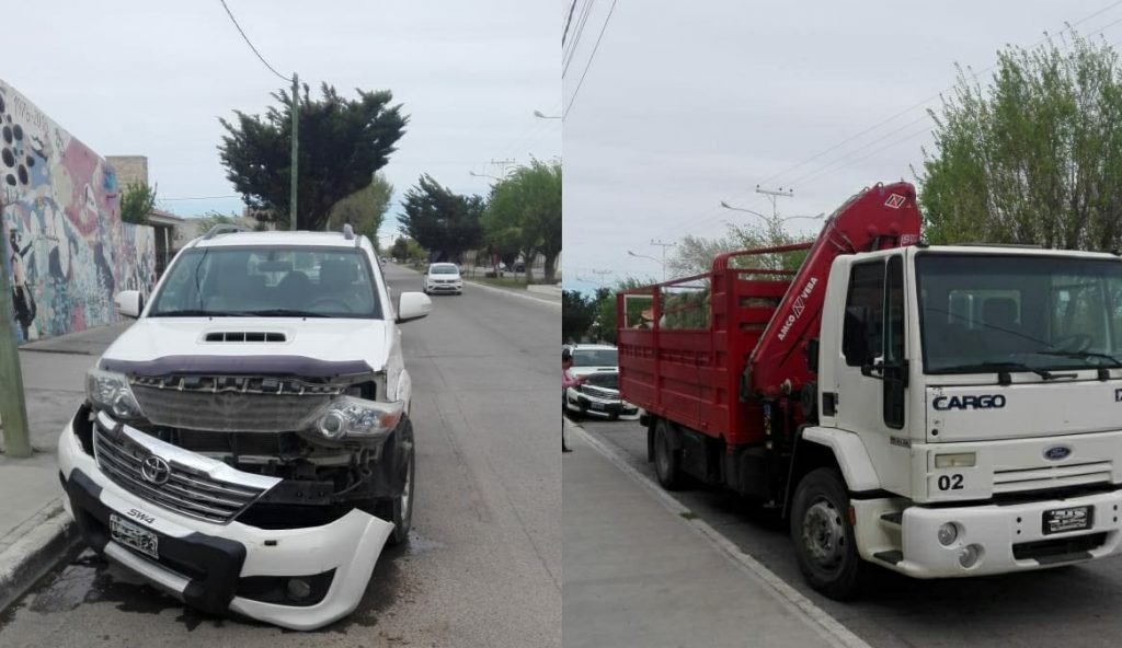 El hecho ocurrió este sábado cerca del mediodía cuando un camión que transportaba fardos de pasto y leña intentó estacionar. Al realizar la maniobra quedó enganchado el guardabarros derecho de una camioneta y le terminó arrancando el paragolpes y otros elementos del frente de la unidad.