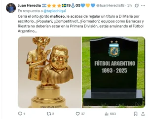 La presencia de «Fideo» fue uno de los focos de las burlas digitales. Diversas ilustraciones mostraron caricaturas del presidente de la AFA, Claudio «Chiqui» Tapia, entregando la copa al ídolo de la Selección en una oficina, cuestionando el mérito deportivo de la consagración.ukFBXQ