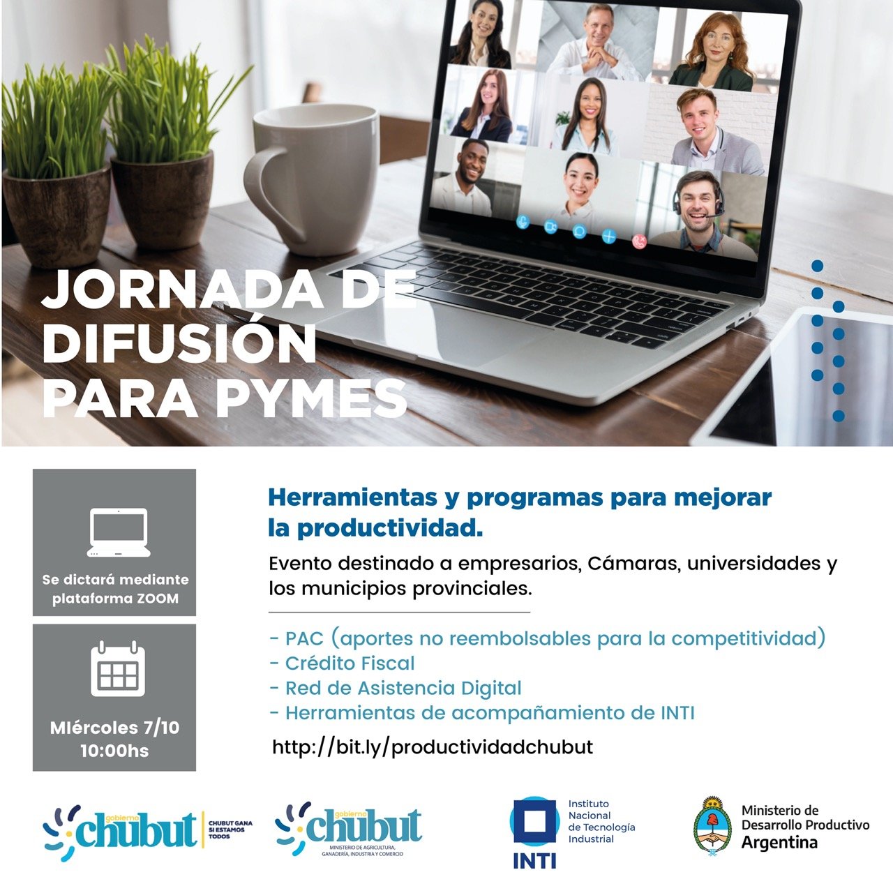 El Ministerio de Agricultura, Ganadería, Industria y Comercio de la Provincia, a cargo de Leandro Cavaco, junto al Ministerio de Desarrollo Productivo de Nación y el Instituto Nacional de Tecnología Industrial (INTI) invita a emprendedores, cámaras, municipios, universidades y PyMEs del Chubut  a la jornada de difusión de herramientas y programas destinadas a mejorar la productividad.