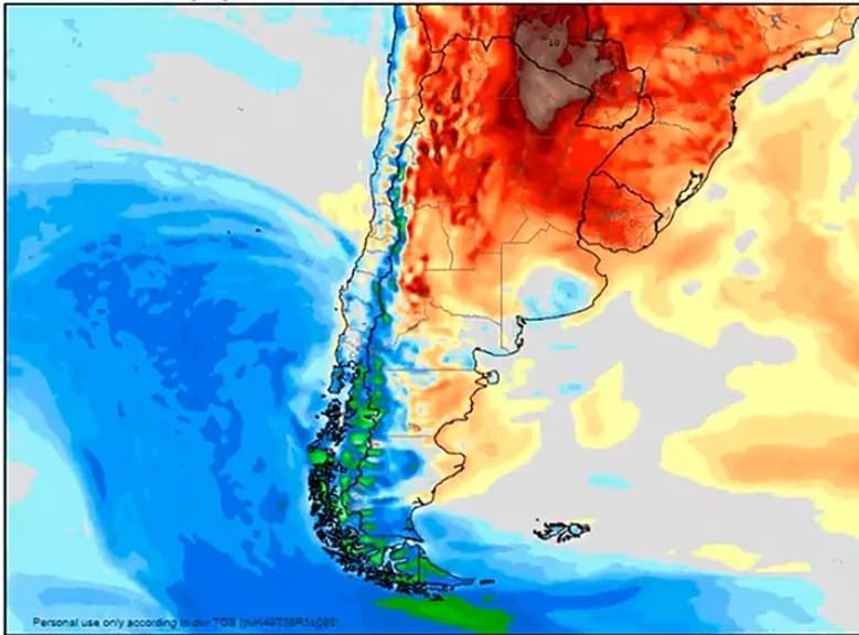 En cuanto a la región central, Reinoso advirtió sobre la posible presencia de “lluvias y tormentas” que podrían llegar a ser intensas, como consecuencia de pasaje de diferentes frentes fríos que van a avanzar hacia el norte del país, favorecidos por la “advección” de aire del sur que generan los sistemas de baja presión al desplazarse sobre la Patagonia.
