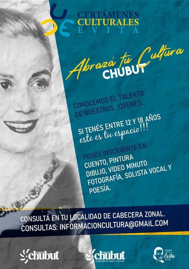 La Secretaría de Ciencia, Tecnología, Innovación Productiva y Cultura del Chubut informa que, a partir de este miércoles 26 y hasta el próximo viernes 11 de septiembre, se encuentra abierta la inscripción para la primera instancia de los Juegos Cultures Evita modalidad virtual 2020, impulsado por el Ministerio de Cultura de la Nación y la cartera de Ciencia y Cultura provincial bajo el lema “Abraza tu Cultura”.