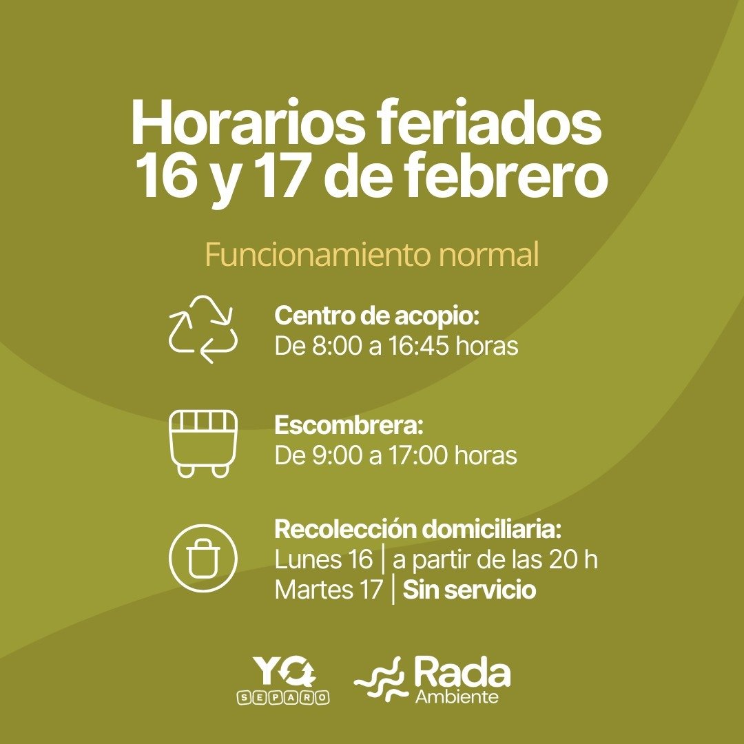 La Municipalidad de Rada Tilly, a través del área de Ambiente, comunicó el esquema de funcionamiento de los servicios para los feriados del lunes 16 y martes 17 de febrero.