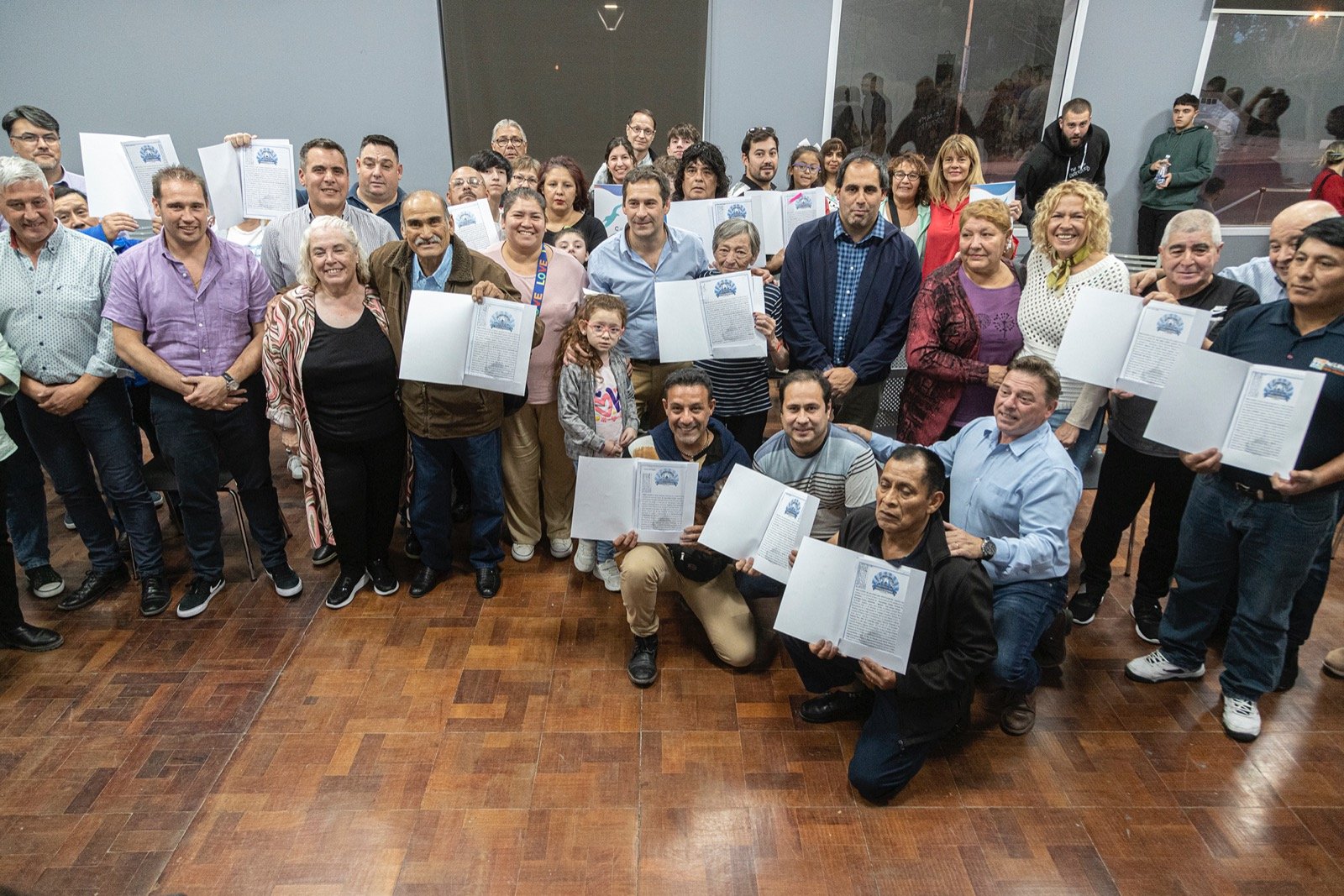 Ayer lunes, el intendente Juan Pablo Luque encabezó el acto oficial de entrega de títulos de propiedad a 45 vecinos de la ciudad en instalaciones del Club Huergo en Km. 3, cumplimentando con el documento que certifica que una persona es la propietaria de un bien inmueble.