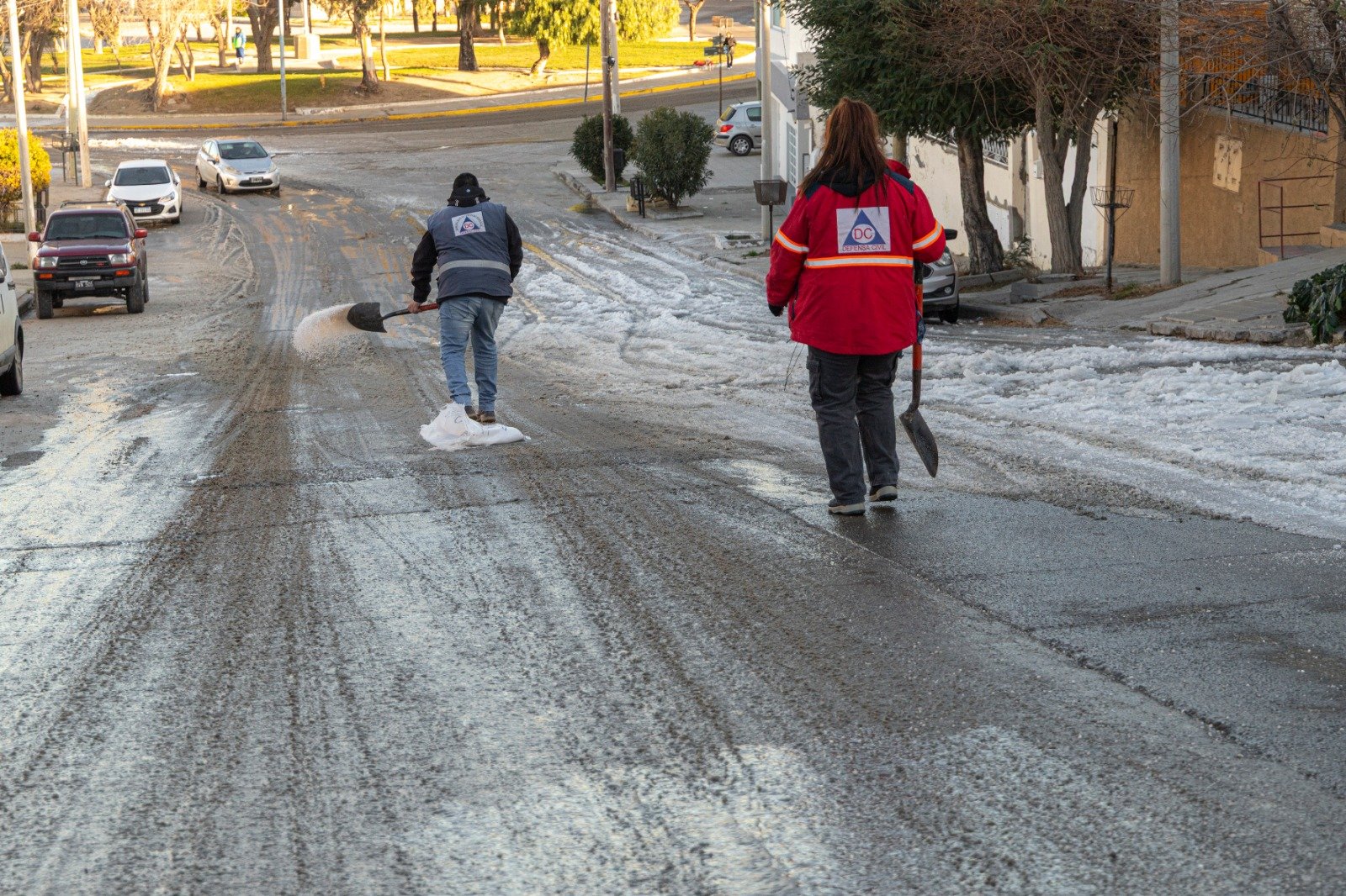 Desde el sábado, el personal de Defensa Civil cumple con recorridos preventivos y arrojado de sal para romper el hielo acumulado en las distintas arterias de la ciudad. No obstante, los trabajos se intensificaron a partir de la tarde-noche del lunes y continuaron durante la madrugada de este martes, con la colaboración del personal de la Dirección General de Tránsito y de la Sociedad Cooperativa Popular Limitada (SCPL).