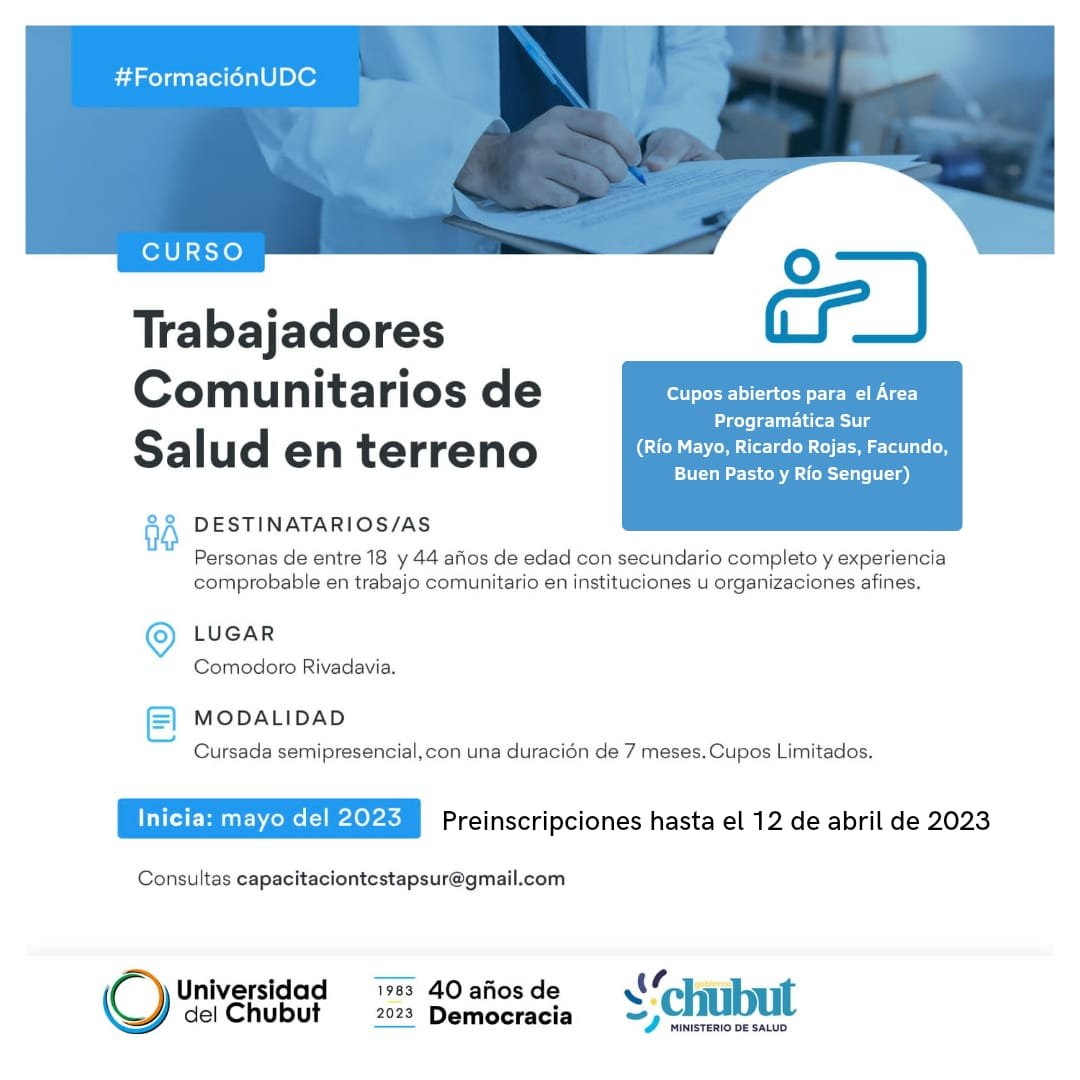 El Ministerio de Salud de la provincia, a través del Área Programática Sur, informó que se extendió hasta el miércoles 12 abril el plazo de pre-inscripción al “Curso para capacitar Trabajadores Comunitarios de Salud en Terreno”, que la Universidad del Chubut (UDC) comenzará a dictar el próximo mes de mayo en la ciudad de Comodoro Rivadavia, en virtud del convenio suscripto con la cartera sanitaria.