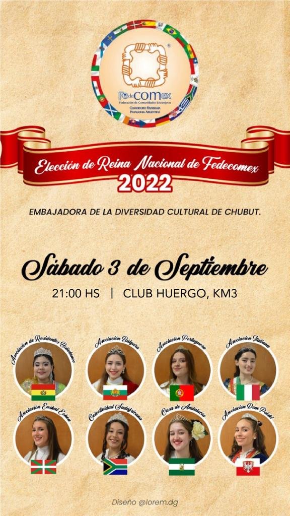 De esta manera, la elección de la soberana de la FeDeCoMex será a las 21 horas en el Club Huergo, donde se presentarán ocho candidatas representantes de las comunidades búlgara, portuguesa, italiana, boliviana, sudafricana, andaluza, polaca y vasca.