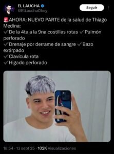 El parte oficial emitido por el hospital, dependiente del Ministerio de Salud de la Provincia de Buenos Aires, detalla que “el paciente Thiago Medina permanece internado en la Unidad de Terapia Intensiva. Se encuentra con asistencia respiratoria mecánica e inotrópicos, bajo estricto control clínico y seguimiento del servicio de cirugía torácica”. Además, se informó que su cuadro “continúa siendo crítico y reservado”, con contacto permanente entre los médicos y la familia.