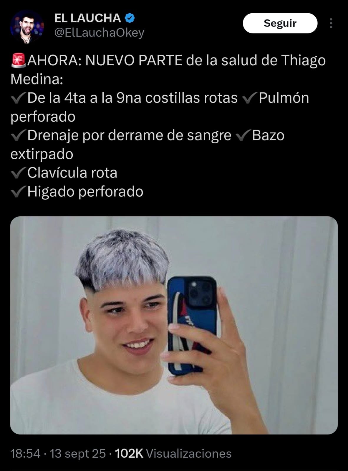 En las últimas horas, se sumó un reporte difundido en redes sociales que aporta más detalles sobre sus lesiones: fracturas entre la cuarta y la novena costilla, perforación pulmonar y hepática, drenaje por derrame de sangre, extirpación del bazo y fractura de clavícula.