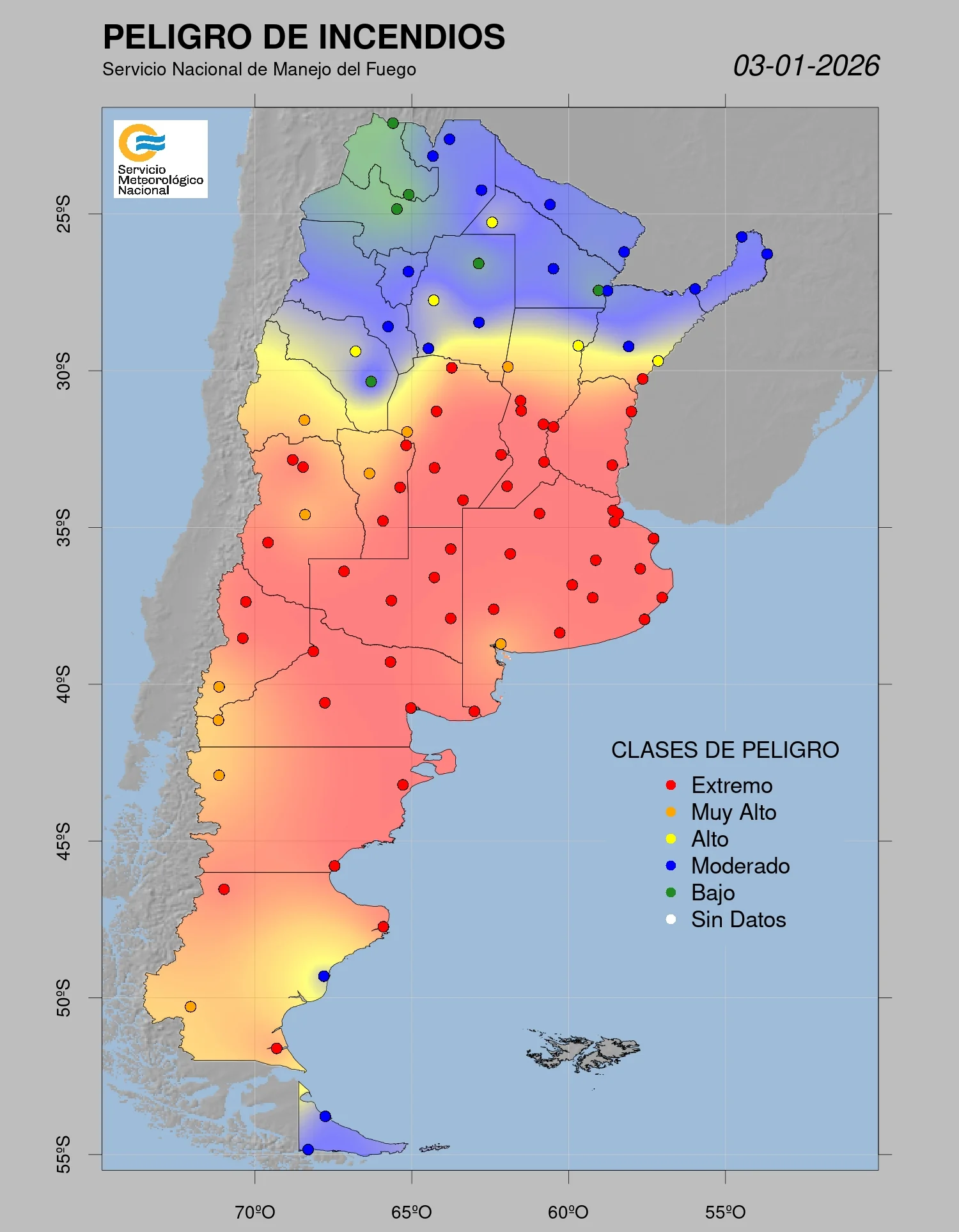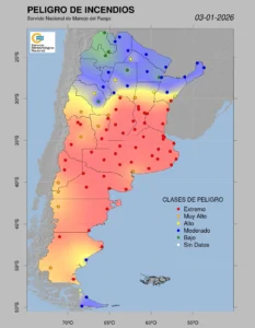 Según la información oficial, este viernes 2 de diciembre Chubut integra el grupo junto a otras 10 provincias del país con riesgo extremo, junto a Buenos Aires, La Pampa, Entre Ríos, Córdoba, Mendoza, Santa Fe, San Luis, Neuquén, Río Negro y Santa Cruz. La combinación de altas temperaturas, sequía persistente y factores climáticos adversos genera un contexto crítico, especialmente en zonas con vegetación seca y exposición al viento, como ocurre en la región. Condiciones que se extenderían al menos hasta el próximo sábado 3 de enero.