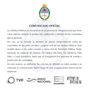 El comunicado fue publicado en la noche de ayer y confirmó la decisión de “pausar temporalmente” el contenido web y de redes de la Televisión Pública, las radios nacionales AM y FM de Buenos Aires y del interior, Paka Paka y Canal Encuentro.