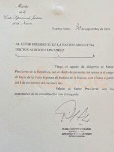 En una carta fechada el 30 de septiembre, la ministra le informó al presidente de la Nación, Alberto Fernández, que dejará el máximo tribunal de Justicia el próximo 1° de noviembre.