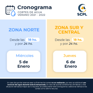 «Informamos a nuestros asociados del Servicio de Agua que, cumpliendo con el cronograma de cortes de agua programados para recuperar reservas en el Puesto La Mata, se interrumpirá el suministro hoy miércoles 05 de enero, desde las 18 horas y por 24 horas en Zona Norte y el jueves 06, desde las 18 horas y por 24 horas en Zona Sur y Central de la ciudad».
