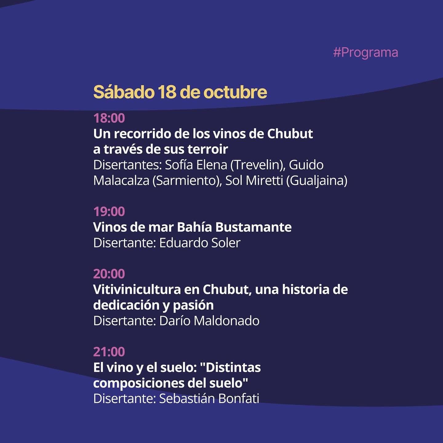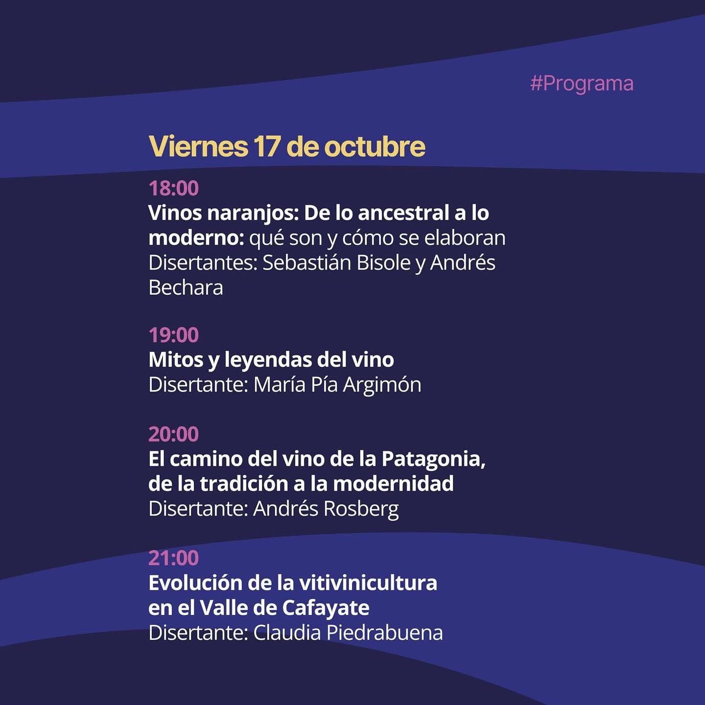 Además habrá charlas durante las dos jornadas, participarán como disertantes Sebastián Bisole y Andrés Bechara, María Pía Argimón, Andrés Rosberg, Claudia Piedrabuena, Sofía Elena, Guido Malacalza, Sol Miretti,Eduardo Soler, Darío Maldonado y Sebastián Bonfati. Estos encuentros incluirán catas y debates sobre la vitivinicultura argentina y patagónica. También se incorporará un espacio premium de Pernod Ricard Argentina, con degustación de destilados importados de primer nivel: whisky, gin y vermut.