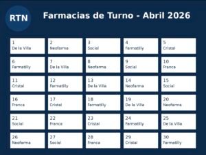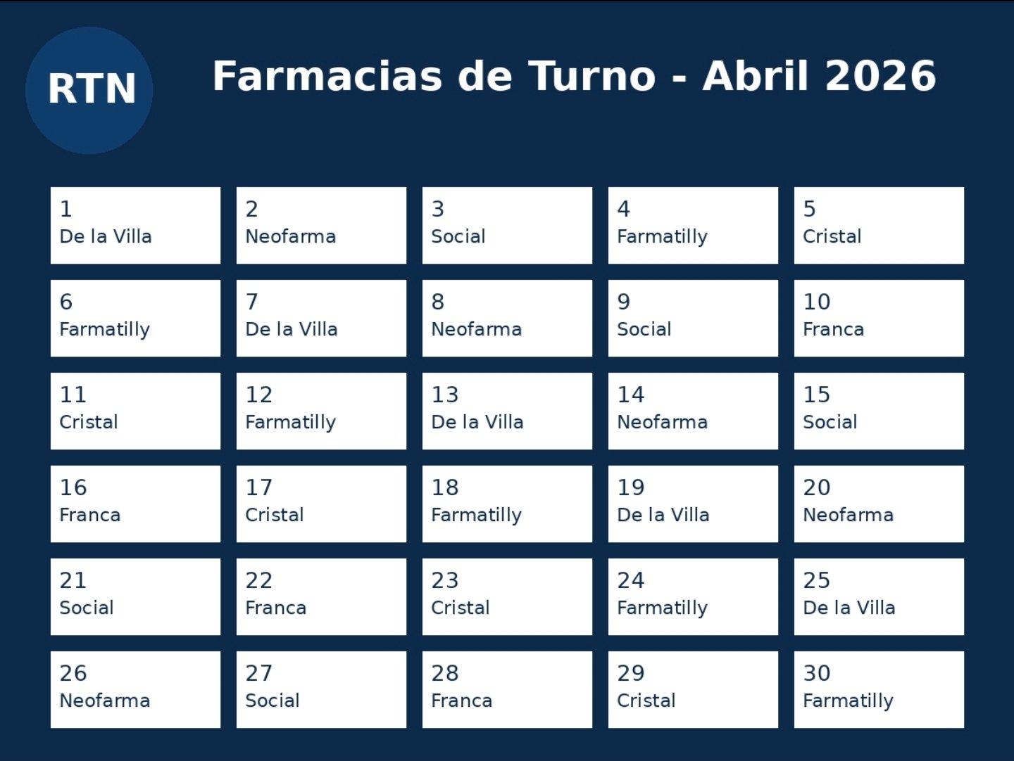 Entre los primeros días de abril, el esquema arrancó el miércoles 1 con Farmacia De la Villa, continuó el jueves 2 con Neofarma, hoy viernes 3 con Social, el sábado 4 con Farmatilly y el domingo 5 con Cristal. La rotación se mantiene de forma consecutiva durante todo el mes bajo el mismo sistema.