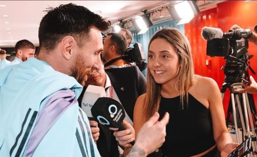 Messi, que escuchó atentamente el mensaje de gratitud con una sonrisa, le agradeció el gesto a la periodista y contó que sintió “el cariño de la gente desde la Copa América para acá”, al tiempo que resaltó lo logrado por el plantel argentino hasta llegar a esta instancia.