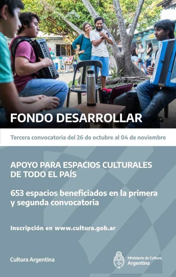El Fondo Desarrollar es un fondo federal concursable que brinda apoyo económico a espacios culturales de cualquier punto del país, para cubrir los gastos corrientes y operativos. Esto abarca a peñas, milongas, clubes de música en vivo, espacios de arte y diseño, librería, circo, danza y teatro independiente. Esta nueva convocatoria contempla, además, la adquisición de equipamiento necesario para afrontar las nuevas exigencias de esta etapa.