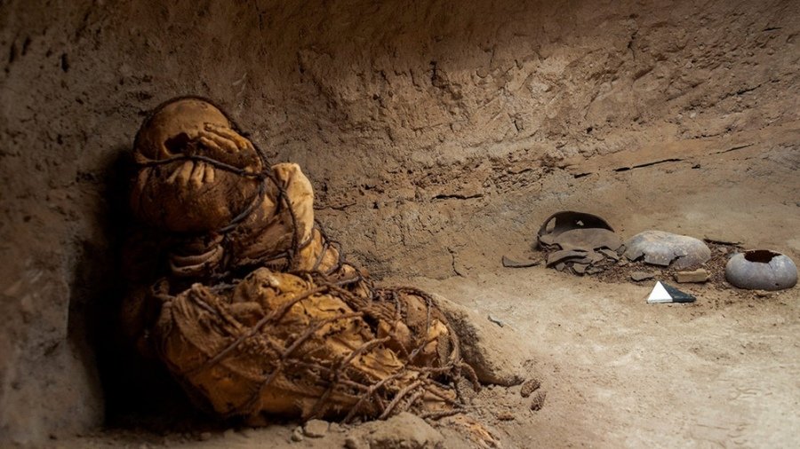 Arqueólogos peruanos hallaron una momia preincaica de entre 1.200 a 800 años de antigüedad atada con sogas mientras excavaban en un milenario complejo urbano de barro en la periferia de Lima.