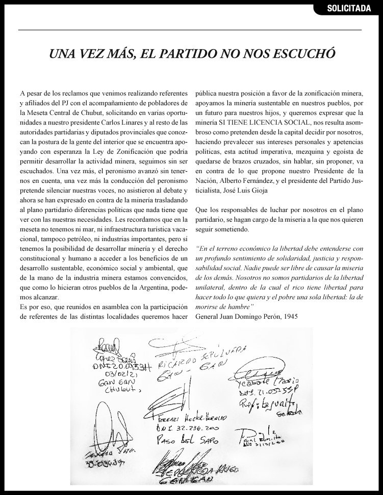 “A pesar de los reclamos que venimos realizando referentes y afiliados del PJ con el acompañamiento de pobladores de la Meseta Central de Chubut, solicitando en varias oportunidades a nuestro presidente Carlos Linares y al resto de las autoridades partidarias y diputados provinciales que conozcan la postura de la gente del interior que se encuentra apoyando con esperanza la Ley de Zonificación que podría permitir desarrollar la actividad minera, seguimos sin ser escuchados.”