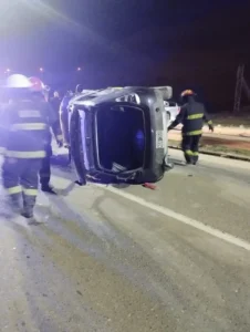 El segundo accidente se produjo a las 20:50 horas del domingo en el kilómetro 1820 de la Ruta Nacional 3. Un Renault Sandero y una Mercedes Benz Sprinter chocaron, provocando el vuelco del Sandero. Su conductor, quien sufrió escoriaciones leves, fue examinado en el lugar y no requirió traslado al hospital. El test de alcoholemia arrojó un resultado positivo de 1.65 g/l, y el vehículo fue secuestrado.