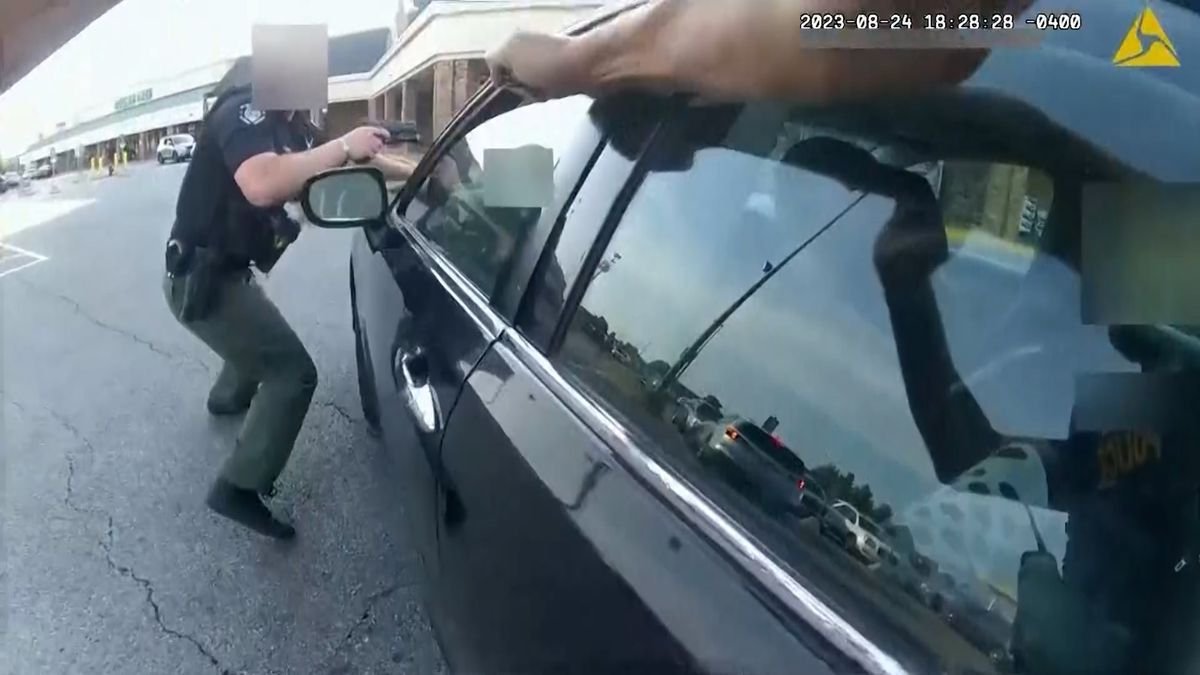 «Sal del coche», responde el primer oficial mientras golpea la ventanilla de Young con una mano y agarra la otra, ligeramente abierta.
