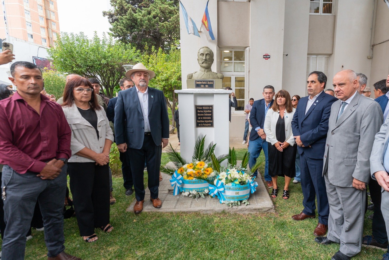 Posteriormente, las autoridades se trasladaron al busto del comodoro Martín Rivadavia, figura histórica que dio nombre a la ciudad, donde también se depositaron ofrendas florales en señal de respeto y reconocimiento a su trayectoria como oficial de la Armada Argentina y sus tareas de hidrografía desarrolladas en el Golfo San Jorge.