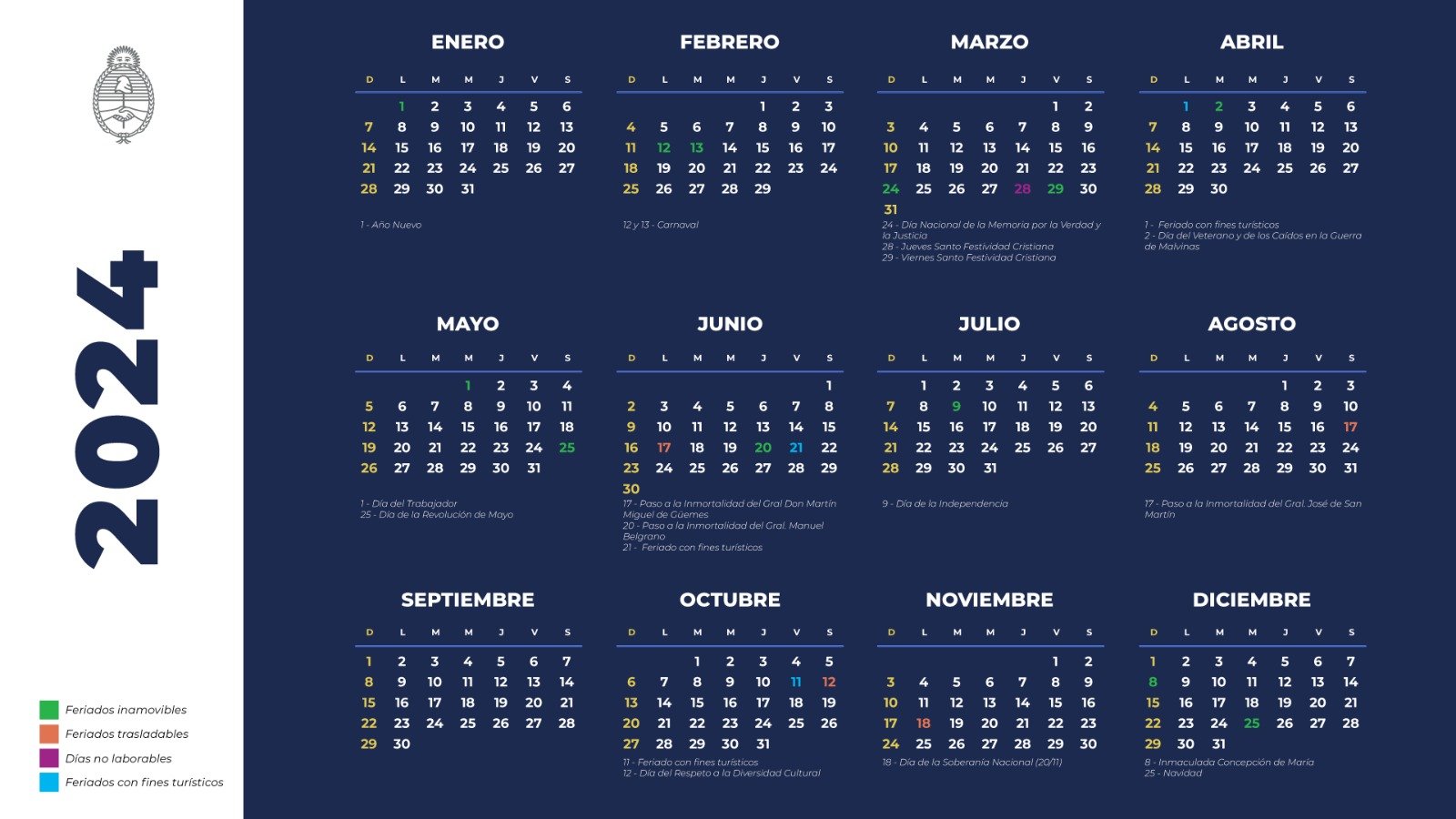 El Gobierno nacional, a través del Ministerio del Interior, oficializó hoy el calendario de feriados correspondiente al 2024.