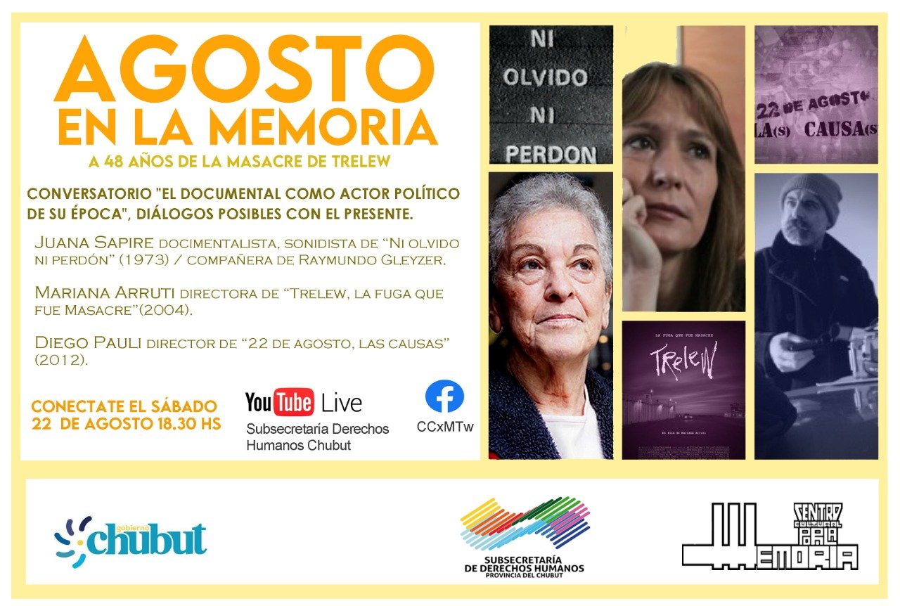 En el marco de la propuesta “Memorias de Agosto” el Centro Cultural por la Memoria de Trelew produjo un ciclo de cinco cortos audiovisuales con material del Archivo Provincial por la Memoria que fueron proyectados durante las primeras semanas y  finalizará el 22  de agosto a las 18.30 Hs en el marco de La Feria del Libro con el Conversatorio Agosto en la Memoria “El documental como actor político de su época, diálogos posibles con el presente”.