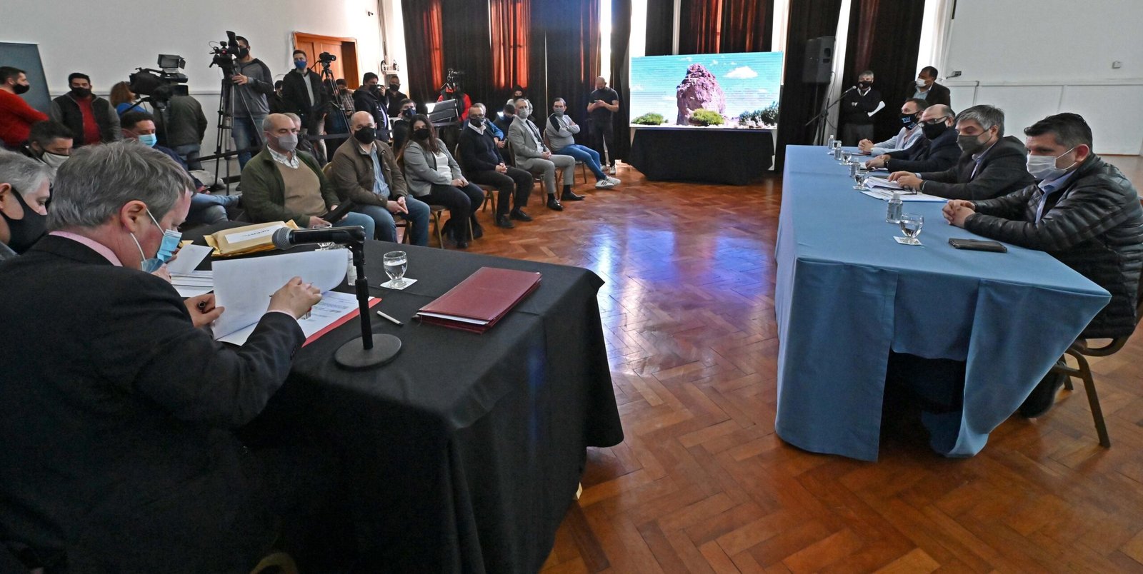 El acto se desarrolló en Casa de Gobierno y contó con la participación de los ministros de Infraestructura, Energía y Planificación, Gustavo Aguilera, y de Turismo, Néstor Garcia, el intendente de Gualjaina, Marcelo Limarieri, el subsecretario de Conservación y Áreas Protegidas, Sergio Cassin, la directora general de Logística, Soledad Díaz Ovejero.
