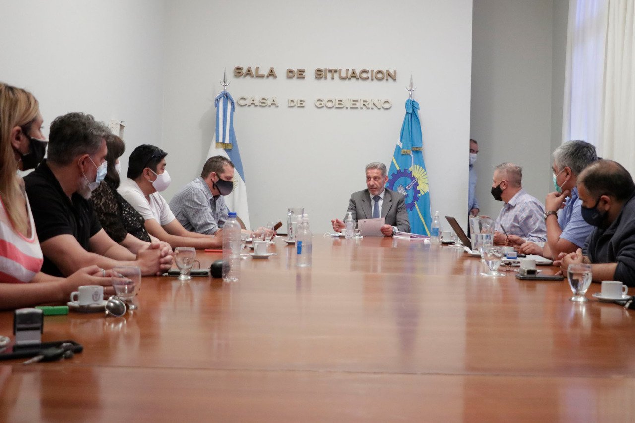El encuentro fue encabezado por el gobernador de la Provincia, Mariano Arcioni, y se realizó esta tarde en la Sala de Situación de Casa de Gobierno. Junto al mandatario provincial estuvieron el ministro de Economía, Oscar Antonena; el ministro de Gobierno y Justicia, José María Grazzini; el secretario de Trabajo, Cristian Ayala, y el subsecretario de Gestión Institucional, Mariano Cabrera.