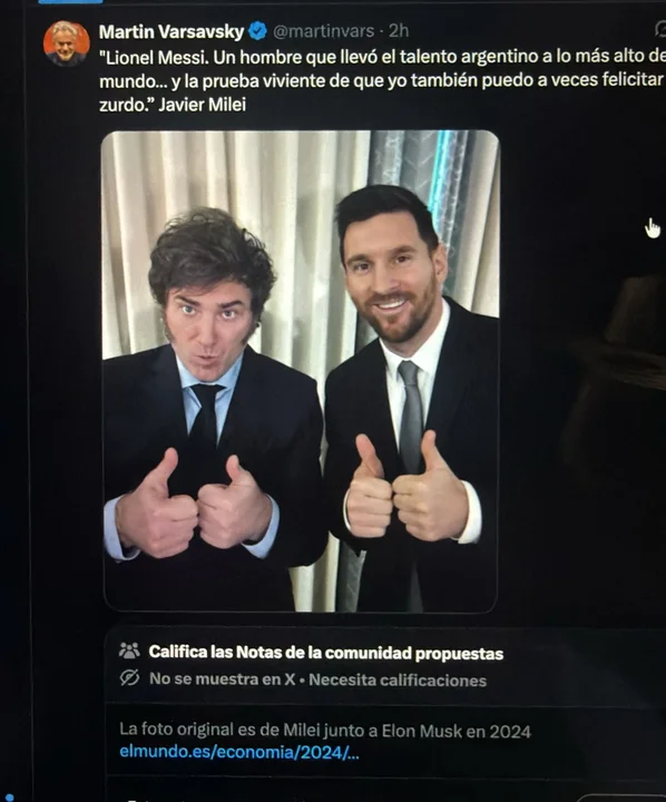 La nota aclaratoria fue contundente: «La foto original es de Milei junto a Elon Musk en 2024». Efectivamente, la imagen viral reemplazaba la cara del dueño de Tesla y X por la del capitán de la Selección Argentina.
