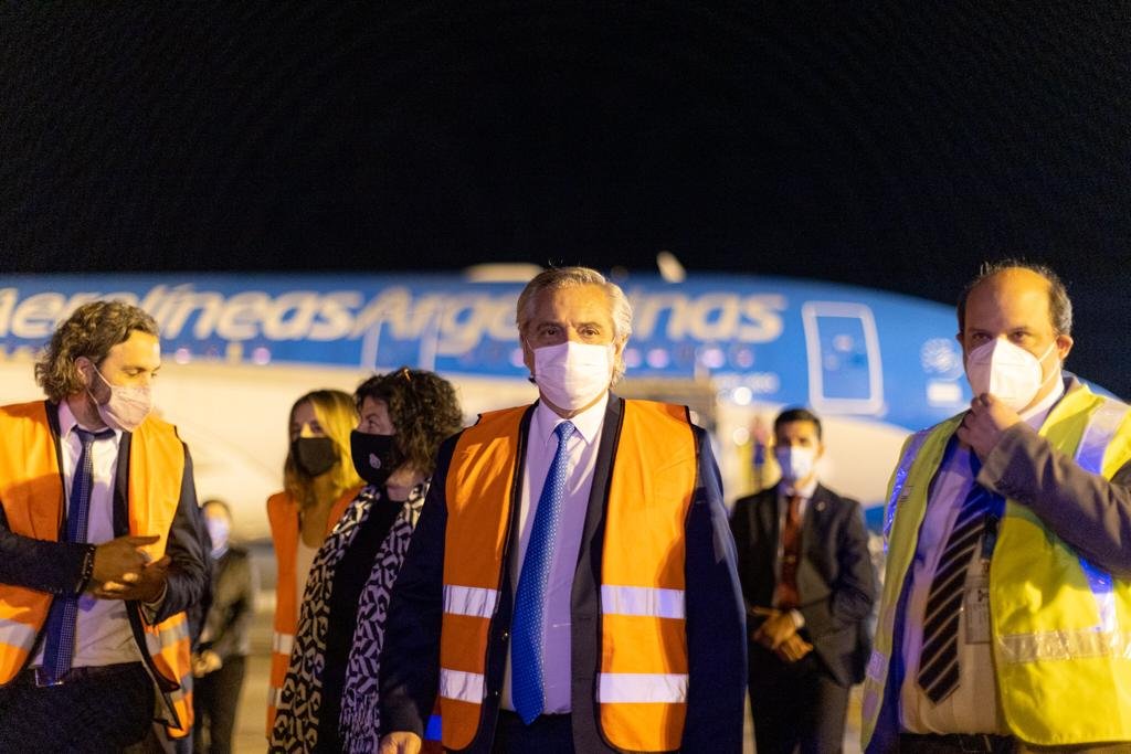 El jefe de Estado, que en diciembre puso en marcha el plan de vacunación para combatir la pandemia del Covid-19 en todo el país, arribó a Ezeiza en el helicóptero presidencial y, ya con el avión de Aerolíneas en tierra, saludó y conversó brevemente con la tripulación del Airbus A330-200.