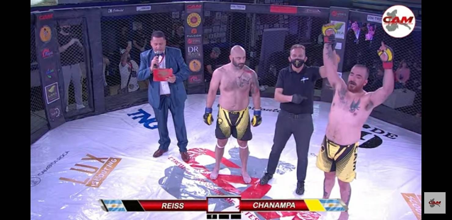 El deportista de Rada Tilly, Juan «Oso» Chanampa se impuso en su pelea del Circuito Argentino de MMA, frente a Sebastian Reiss, en el súper 8 en la categoría hasta 93 kg.