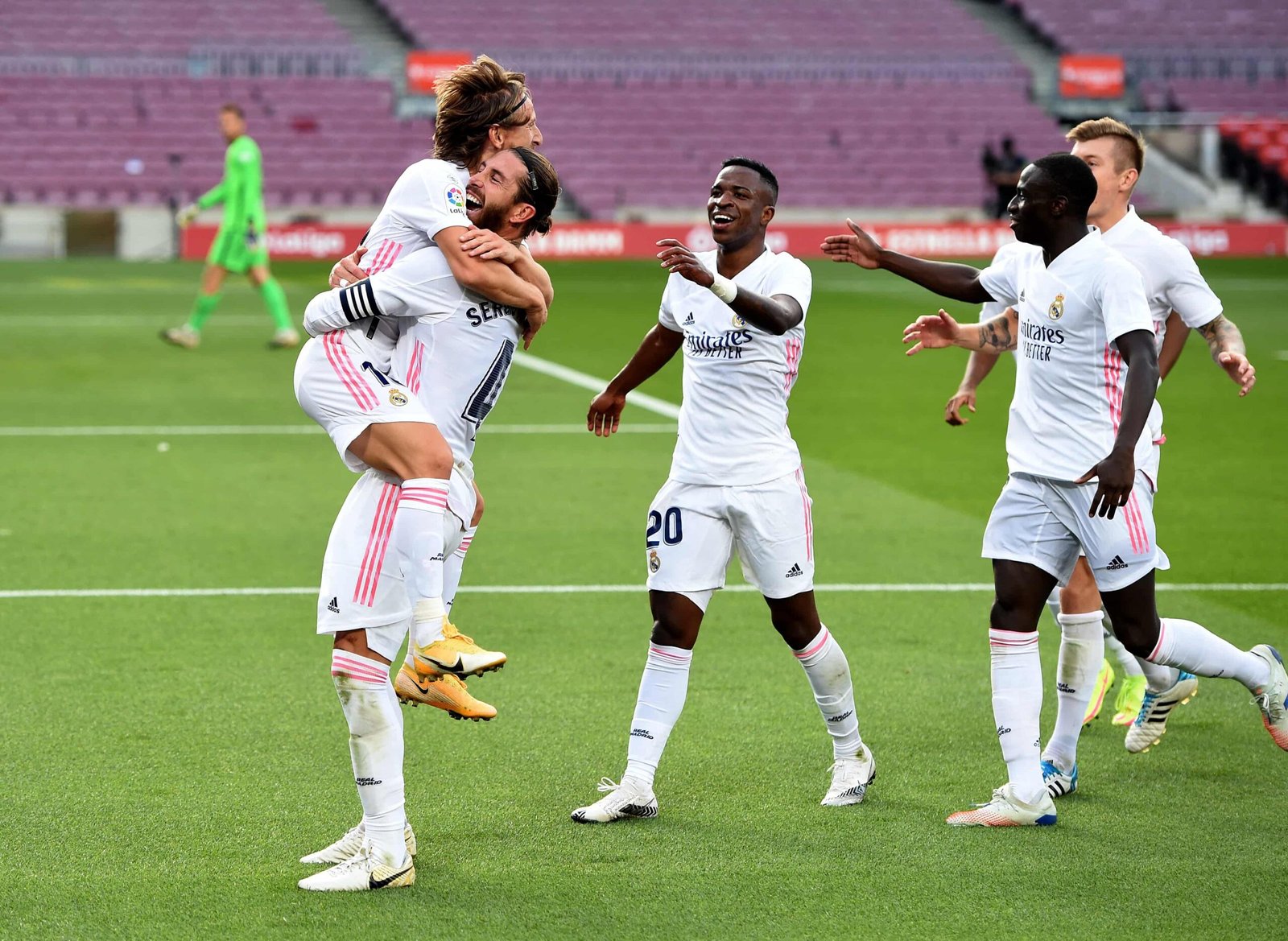 Ya en el complemento, la escuadra del francés Zinedine Zidane se puso en ventaja por intermedio de un penal convertido por Sergio Ramos, tras una polémica sanción por un leve agarrón de Clement Lenglet –de pésimo partido como toda la defensa baulgrana– sobre el capitán merengue.